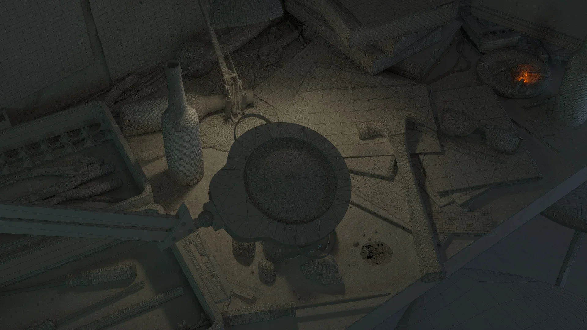After building the scene and filling it with props, I had a great time creating some of the textures in Substance Painter for objects like the desk, lamp, and magnifying glass. For other objects like the crumpled papers and newspapers I made them in Photoshop and used Bitmap2Material to get the normals and roughness maps.